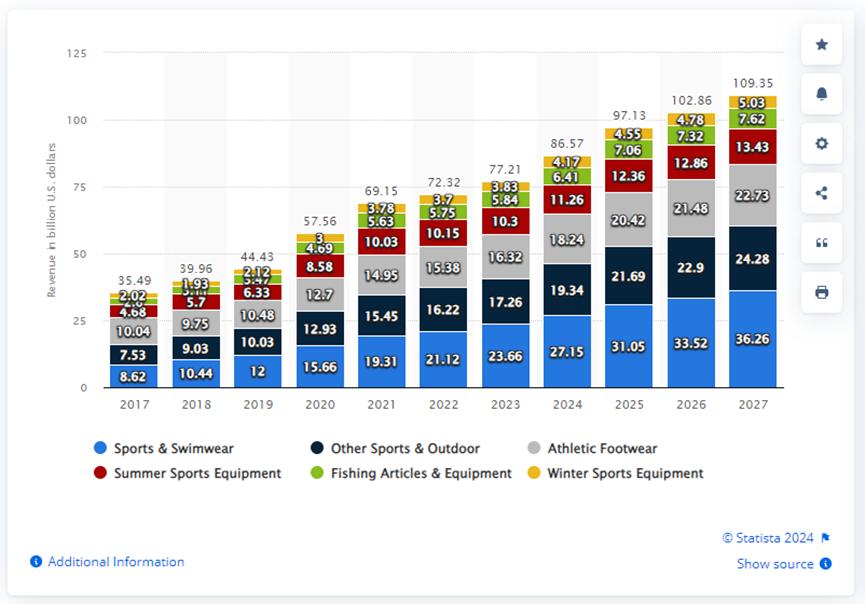 作為戶外運(yùn)動(dòng)細(xì)分市場(chǎng)之一的水上運(yùn)動(dòng)已經(jīng)釋放出持續(xù)增長(zhǎng)的積極信號(hào),那么就更大的市場(chǎng)來(lái)說(shuō),戶外運(yùn)動(dòng)產(chǎn)品類目擁有著更多的商機(jī)。來(lái)自研究機(jī)構(gòu)Statista的數(shù)據(jù)表明,2024年,全球運(yùn)動(dòng)及戶外電商市場(chǎng)預(yù)計(jì)達(dá)到865.7億美元。經(jīng)過(guò)幾年的發(fā)展,這一數(shù)字到2027年時(shí)有望飆升至1093.5億美元。
