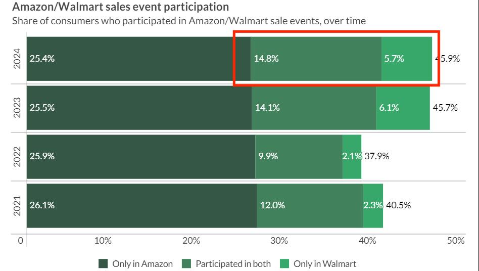 數據指出,今年大促期間,大約有40%的消費者參與了亞馬遜Prime Day,20%的消費者參加了沃爾瑪會員周。與2022年相比,亞馬遜Prime Day的參與率變化不大,但沃爾瑪會員周的參與率卻顯著增長了8%。這主要得益于沃爾瑪會員訂閱率的大幅增長,數據顯示,2023年沃爾瑪會員訂閱量大幅提升了30%。