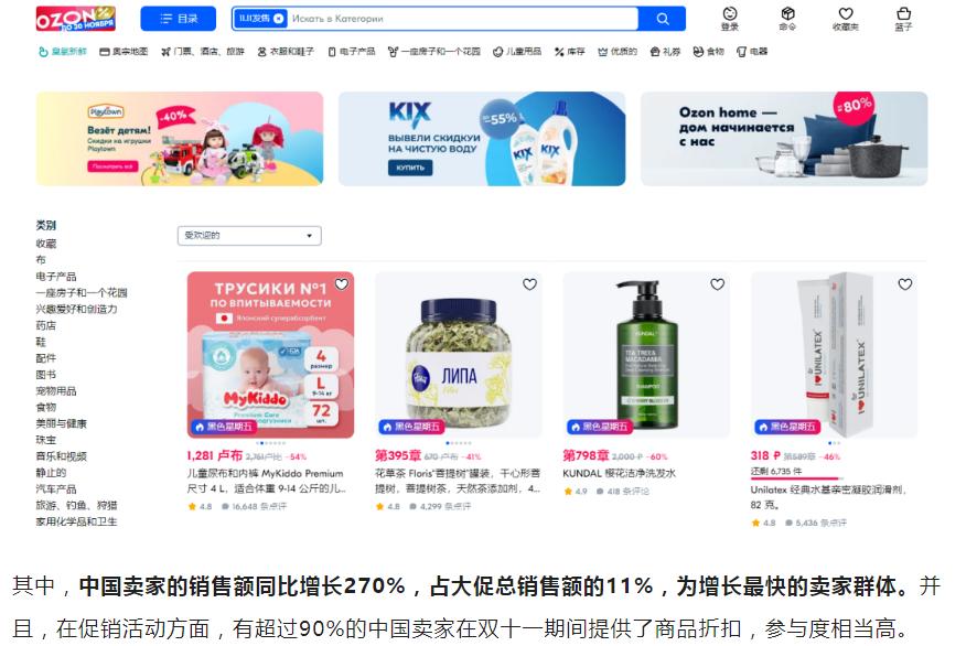 值得注意的是,中國市場在Ozon的增長中扮演了舉足輕重的角色。在2023年11月9日到11月11日為期三天的年底大促期間,Ozon平臺總銷售額高達300億盧布,其中中國賣家的銷售額同比暴漲270%,占大促總銷售額的11%,成為平臺上增長最快的賣家群體。