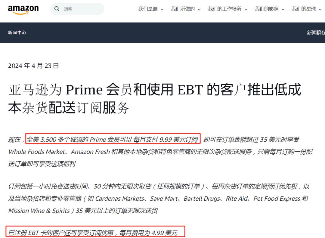 今年4月份,亞馬遜就針對Prime會員和EBT卡持有者推出了一項9.99美元雜貨配送服務。對于Prime會員,他們每個月花費9.99美元就可以享受在Amazon fresh購買商品超過35美元的免費配送到家服務;對于EBT卡持有者,這項花費還更少,僅需4.99美元就能享受到相應服務。