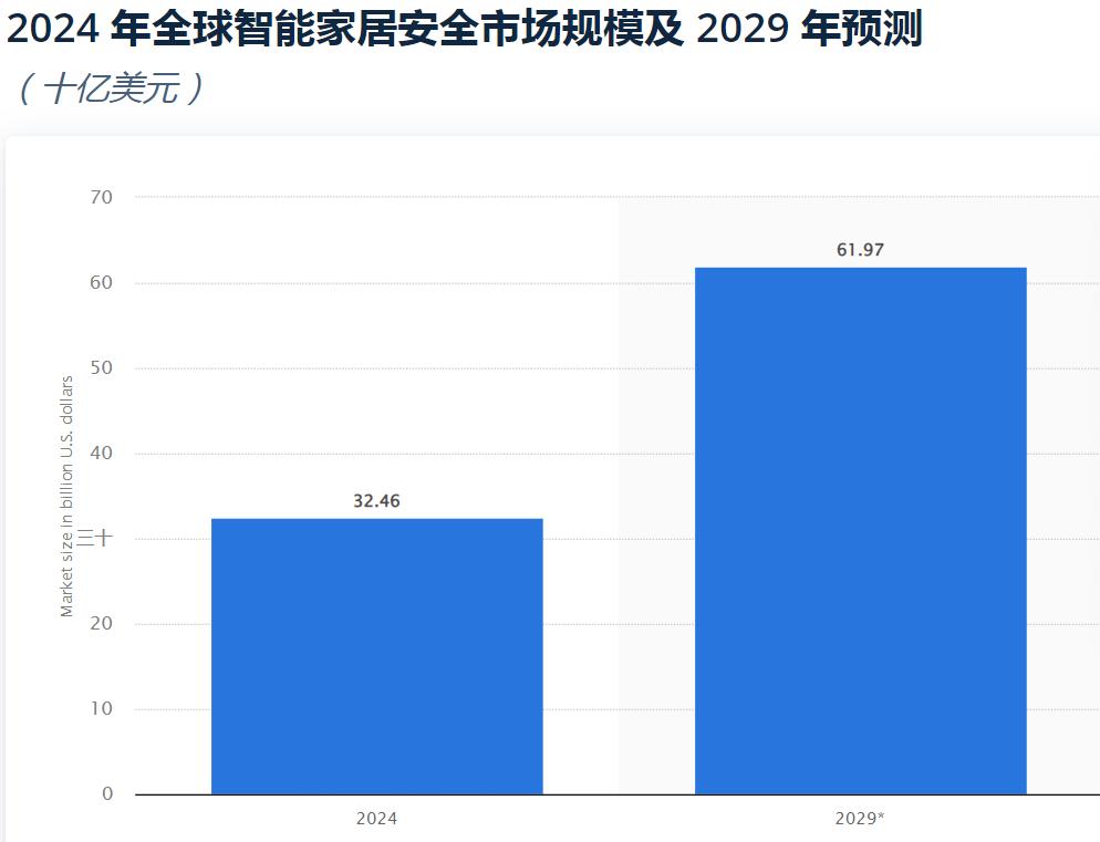 當(dāng)然了,站在風(fēng)口上才能飛得更高,螢石網(wǎng)絡(luò)在智能安防用品市場上的佳績離不開巨大的市場需求的助攻。來自Statista的預(yù)測顯示,2024年,全球智能家居安全市場規(guī)模約為325億美元,這一數(shù)字到2029年或?qū)⒃鲩L至620億美元。