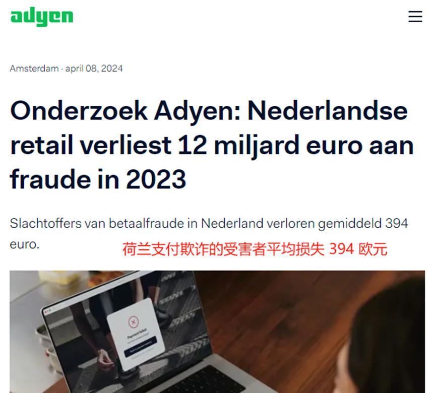 話又說回來,盡管荷蘭電商發(fā)展態(tài)勢(shì)很好,但這一市場(chǎng)目前確實(shí)還存在一些問題,比方說網(wǎng)絡(luò)詐騙。今年4月,金融技術(shù)平臺(tái)Adyen發(fā)布了一項(xiàng)研究報(bào)告,結(jié)果顯示,過去一年,超過四成(43%)的荷蘭消費(fèi)者都曾遭受支付和身份驗(yàn)證方面的網(wǎng)絡(luò)詐騙,人均損失394歐元。荷蘭整個(gè)零售業(yè)也因網(wǎng)絡(luò)詐騙而受到打擊,2023年整個(gè)行業(yè)的損失高達(dá)124億歐元。