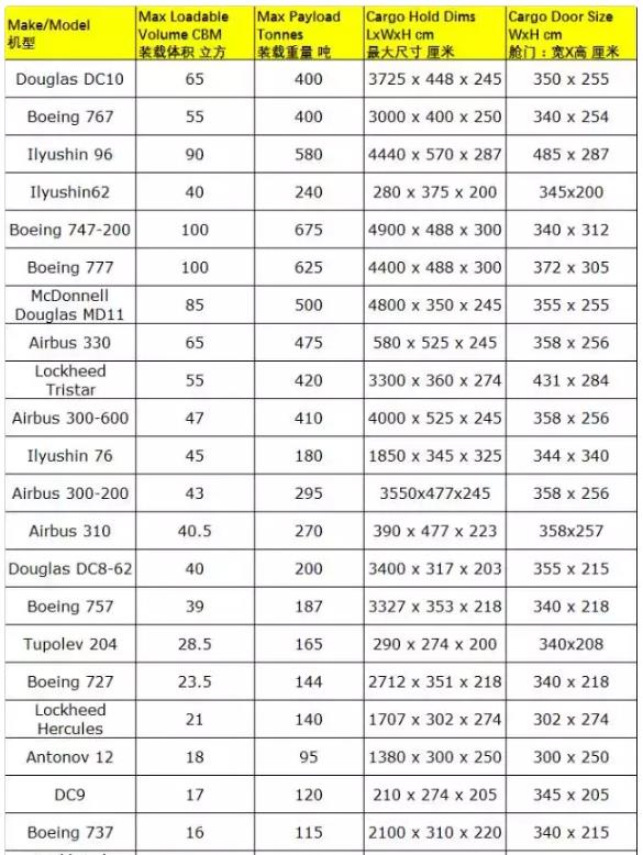 最后再給大家分享一下現(xiàn)在國際空運(yùn)常用的全貨機(jī)的相關(guān)型號(hào)規(guī)格,共大家日后工作需要。