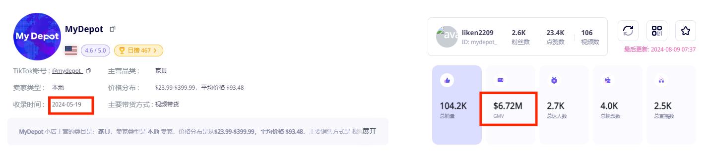根據Echotik數據,MyDepot大約在今年5月下旬上線TikTok Shop美國站。盡管起步較晚,但MyDepot的增長勢頭卻十分強勁。在上線僅80天左右,MyDepot小店的銷量就超過了10萬,累計銷售額更是突破670萬美金。