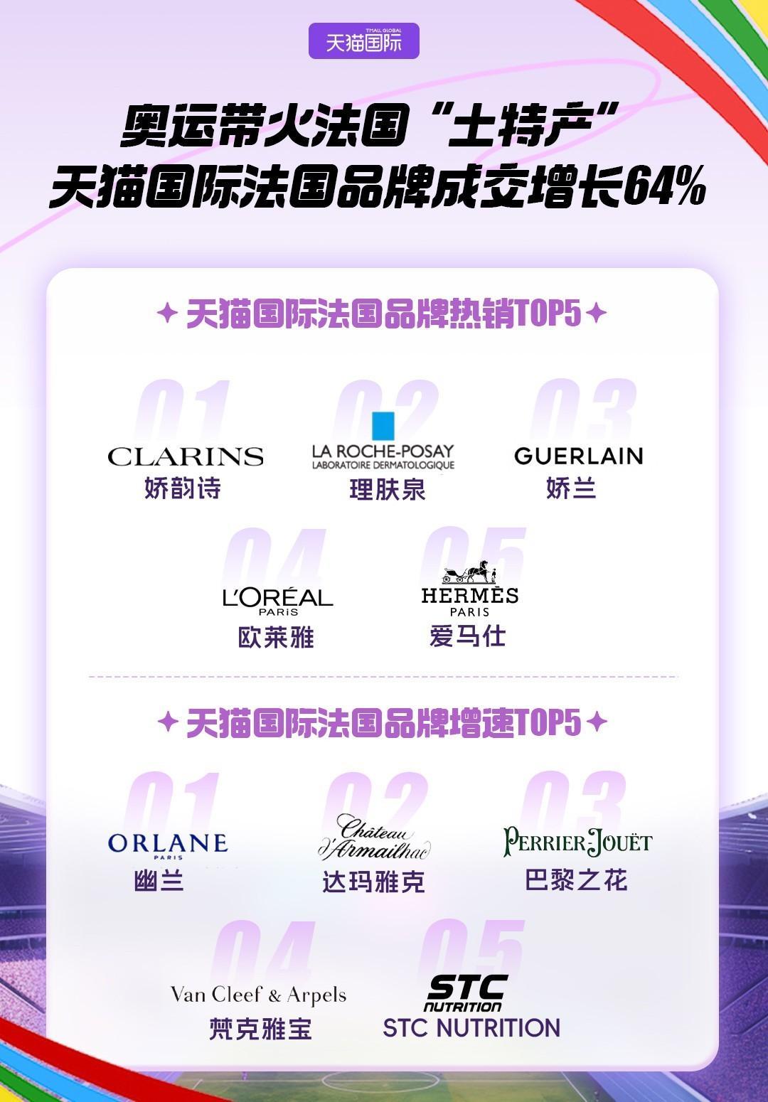除了中國消費者熟悉的國際大牌,來自法國的新品牌在奧運期間也迎來強勁增長。去年6月入駐天貓國際的法國貴族護膚品牌ORLANE幽蘭,成交相比去年同期漲超300倍,干紅葡萄酒品牌Chateau d’Armailhac達瑪雅克,成交同比增長200倍,香檳酒品牌Perrier-Jouet巴黎之花成交增長70倍。