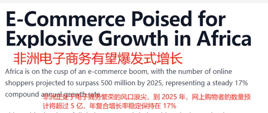一方面,非洲不僅人口眾多,而且經濟也在快速增長,消費市場潛力無窮,經濟學人智庫(EIU)在報告中就提到:“到2024年,非洲大陸有望成為世界上增長第二快的主要經濟體。“另一方面。如今非洲政府對發展數字經濟的重視程度持續加深,各大市場電商基礎設施也在逐漸完善,數據顯示,到2025年,非洲網上購物者數量預計將超過5億。