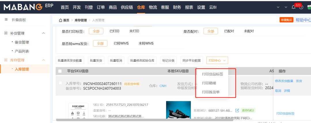 在發貨環節,馬幫ERP能夠根據訂單信息自動生成并打印出符合規范的貨品標簽、箱嘜以及揀貨單,不僅大大提高了工作效率,減少了人為錯誤,還提升了包裹處理的準確性和速度。