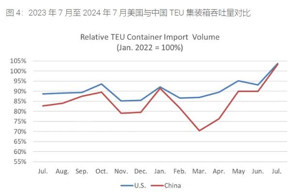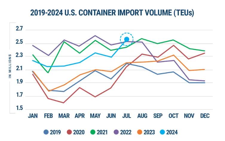 根據物流技術提供商笛卡爾系統集團發布的8月份全球航運報告,2024年7月,美國集裝箱進口量較2023年7月同比增長16.8%至255.6萬TEU(20英尺標準箱),創下了自2022年5月以來長達26個月的歷史新高。