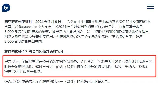 Bazaarvoice發布的《2024 年全球假日季消費者行為報告》顯示,美國消費者已經開始積極準備迎接假日購物季,21%的受訪者表示將在8月或更早開始購買禮物,32%的受訪者將在9月份開始購買,而54%的受訪者將在10月份開始購物。