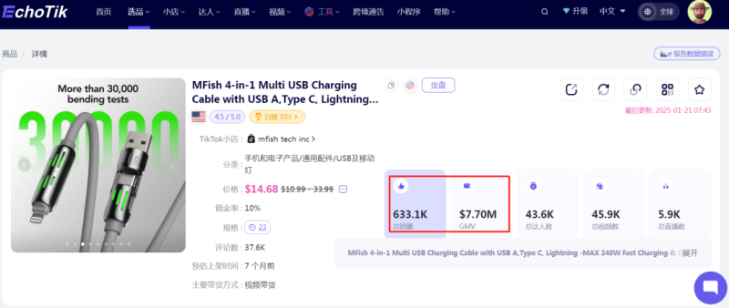 數碼配件品牌Mfish便是順利打入海外市場的一員。根據Echotik統計的數據,上架不到一年,Mfish在TikTok美區開設的小店就賣出了超過67萬件產品,創收832萬美金。其中,Mfish的一款4合1數據線幾乎撐起了整個店鋪的銷售業績,上線7個月賣出超63萬件,斬獲了770萬美金的GMV。