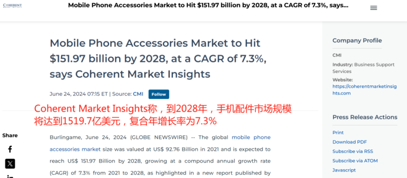 來自Coherent Market Insights發布的一份研究報告顯示,全球手機配件市場規模早在2021年就已經達到了驚人的927.6億美元,預計到2028年將達到1519.7億美元。在2021年至2028年期間,這一市場的復合年增長率將保持在一個較高水平,預計為7.3%。