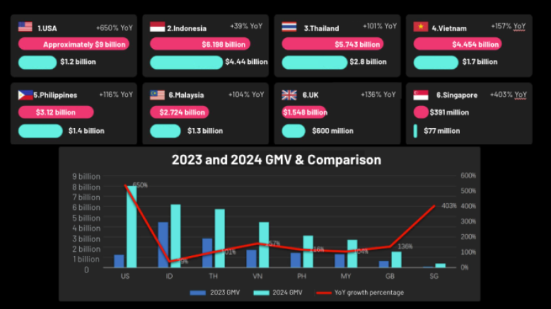 此前,視頻商務(wù)數(shù)據(jù)分析公司Tabcut.com發(fā)布2024年TikTok Shop全球GMV預(yù)測(cè)數(shù)據(jù),2024年TikTok Shop的全球GMV達(dá)到約326億美元,其中美國(guó)市場(chǎng)收入占比最高,達(dá)到約90億美元,同比增幅超過(guò)100%。當(dāng)然這主要也是因?yàn)門(mén)ikTok電商在美國(guó)市場(chǎng)上線較晚。