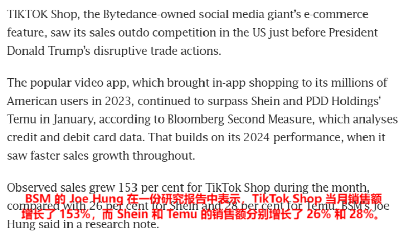 近日,美國(guó)信用卡和借記卡交易監(jiān)測(cè)平臺(tái)BSM發(fā)布了一項(xiàng)關(guān)于TikTok Shop的銷(xiāo)售數(shù)據(jù),今年1月,TikTok Shop美區(qū)銷(xiāo)售表現(xiàn)亮眼,銷(xiāo)售額大漲153%,超越其競(jìng)爭(zhēng)對(duì)手Shein和Temu,后者的銷(xiāo)售額同比增長(zhǎng)比例分別為26%和28%。