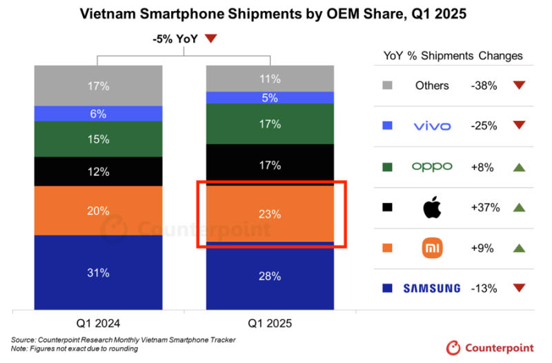 Counterpoint最新數(shù)據(jù)顯示,2025年第一季度,越南智能手機(jī)市場(chǎng)整體出貨量同比下降5%,小米成為Top5中唯一正增長的品牌,出貨量同比上漲9%,市場(chǎng)份額達(dá)23%,排名第二。