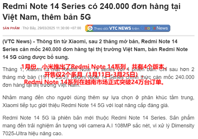 Redmi Note 14銷量強(qiáng)勁 圖源:tcnews.vn