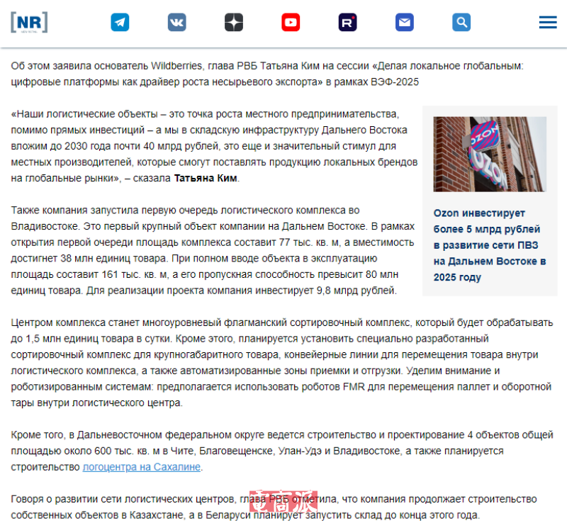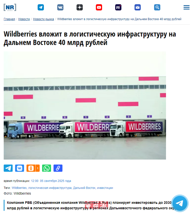 9月9日消息,Wildberries和Russ合并后的公司RVB近日宣布,到2030年將在俄羅斯遠(yuǎn)東地區(qū)的物流基礎(chǔ)設(shè)施投資近400億盧布。這些物流項目不僅是直接投資,也將成為推動地方經(jīng)濟和中小企業(yè)發(fā)展的動力,使本地品牌能夠進入全球市場。