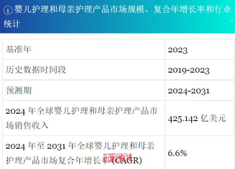 據(jù)Cognitive Market Research發(fā)布的數(shù)據(jù)顯示,2024年母嬰護(hù)理產(chǎn)品市場(chǎng)規(guī)模已達(dá)到425.142億美元,在2024年至2031年期間,復(fù)合年增長(zhǎng)率將保持在6.6%。