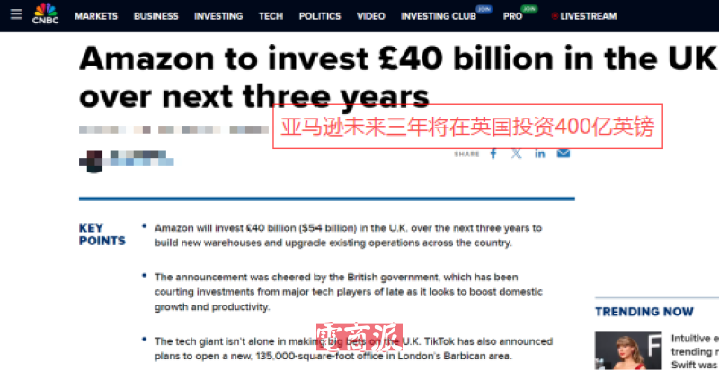 亞馬遜將在英國投資百億英鎊?圖源:CNBC