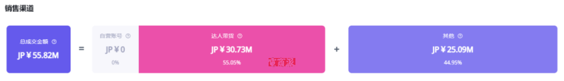 從成交渠道來看,這家小店主要靠達(dá)人帶貨出圈,全店累計(jì)5582萬日元銷售額中,超過一半來自達(dá)人帶貨,剩余部分則由商城商品卡、店鋪主頁、櫥窗、搜索等渠道推動,即短視頻和直播以外的所有渠道,自營賬號收入為零。
