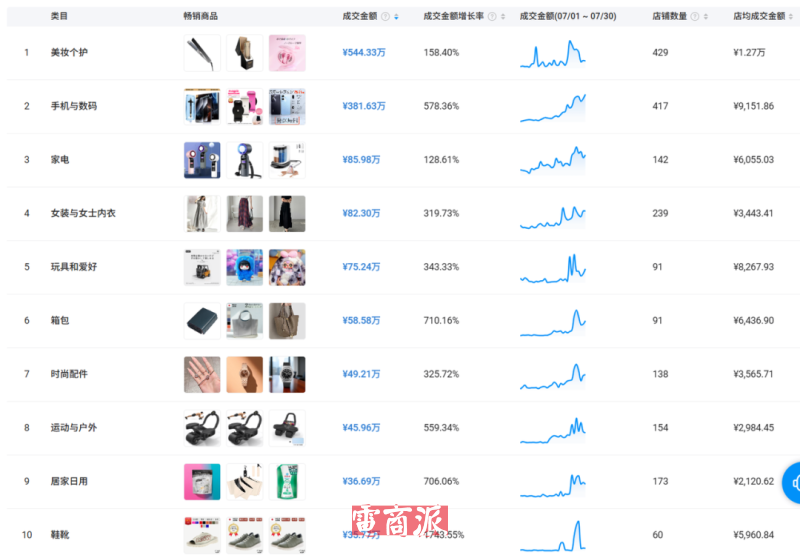 TikTok Shop日本站首月GMV前十大類目 圖源:Kalodata