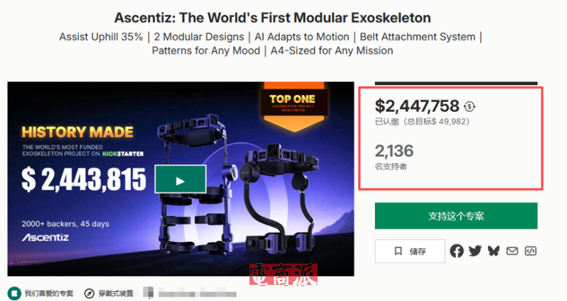 近日,杭州程天科技發(fā)展有限公司(以下簡稱“程天科技”)旗下消費級外骨骼機器人品牌Ascentiz,在眾籌平臺Kickstarter發(fā)起了一個外骨骼機器人眾籌項目,先后吸引了2000多人支持,兩個月不到籌得資金超240萬美元(約合人民幣1710萬元)。