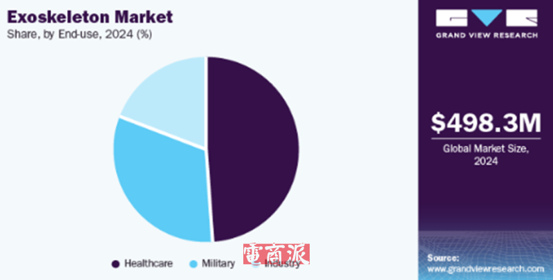 Grand View Research數(shù)據(jù)顯示,2024年全球外骨骼市場規(guī)模估計為4.9833億美元,預(yù)計到2030年將達(dá)到12.5億美元,復(fù)合年增長率達(dá)到驚人的16.27%,其中針對下肢的外骨骼機器人在收入份額上占據(jù)市場主導(dǎo)地位。