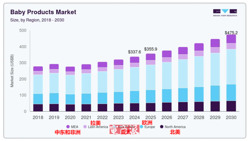 據(jù)市場調(diào)查機構Grand View Research的數(shù)據(jù),2025年全球嬰兒用品市場規(guī)模估計為3559億美元,到2030年該市場預計增至4752億美元,復合年增長率為5.9%。