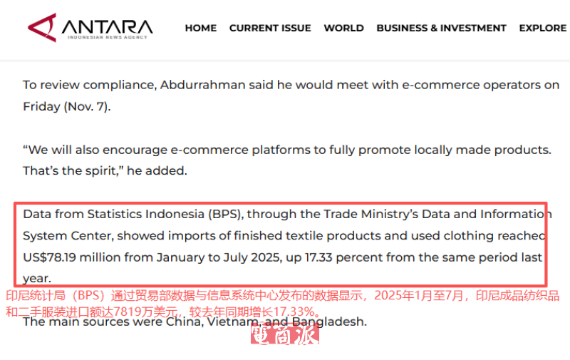 據印尼統計局(BPS)及貿易部數據中心的數據,2025 年 1-7 月成衣、舊衣及廢布類目進口額達到 7,819 萬美元,同比增長 17.33%,這些進口商品主要來自中國、越南、孟加拉、臺灣和新加坡。