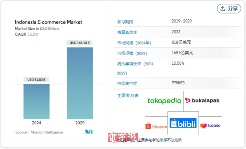 詳細來看,據Mordor Intelligence發布的數據顯示,2024年,印尼電商市場的規模大約為818億美元,到2029年該市場規模有望飆升至1681億美元,期間預計復合年增長率為15.5%