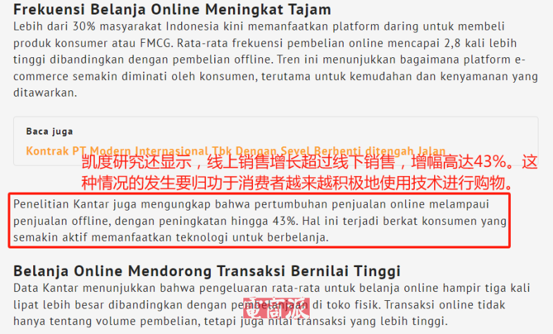 據了解,此前有數據顯示超三成的印尼消費者會網購消費品或快速消費品,購物頻率是線下的2.8倍,線上購物的支出比例幾乎是線下支出的三倍。凱度研究的數據也表明,印尼的線上銷售增速遠超線下,增長率高達43%,高于許多其他國家的電商市場