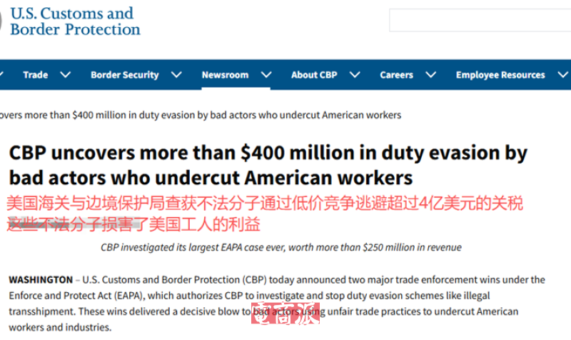 根據美國海關和邊境保護局披露的數據,今年1月至8月,通過EAPA反規避程序追繳和揭露的未繳稅額已經超過4億美元,涉及虛假審包、偽造文件、產地虛標等多個環節。